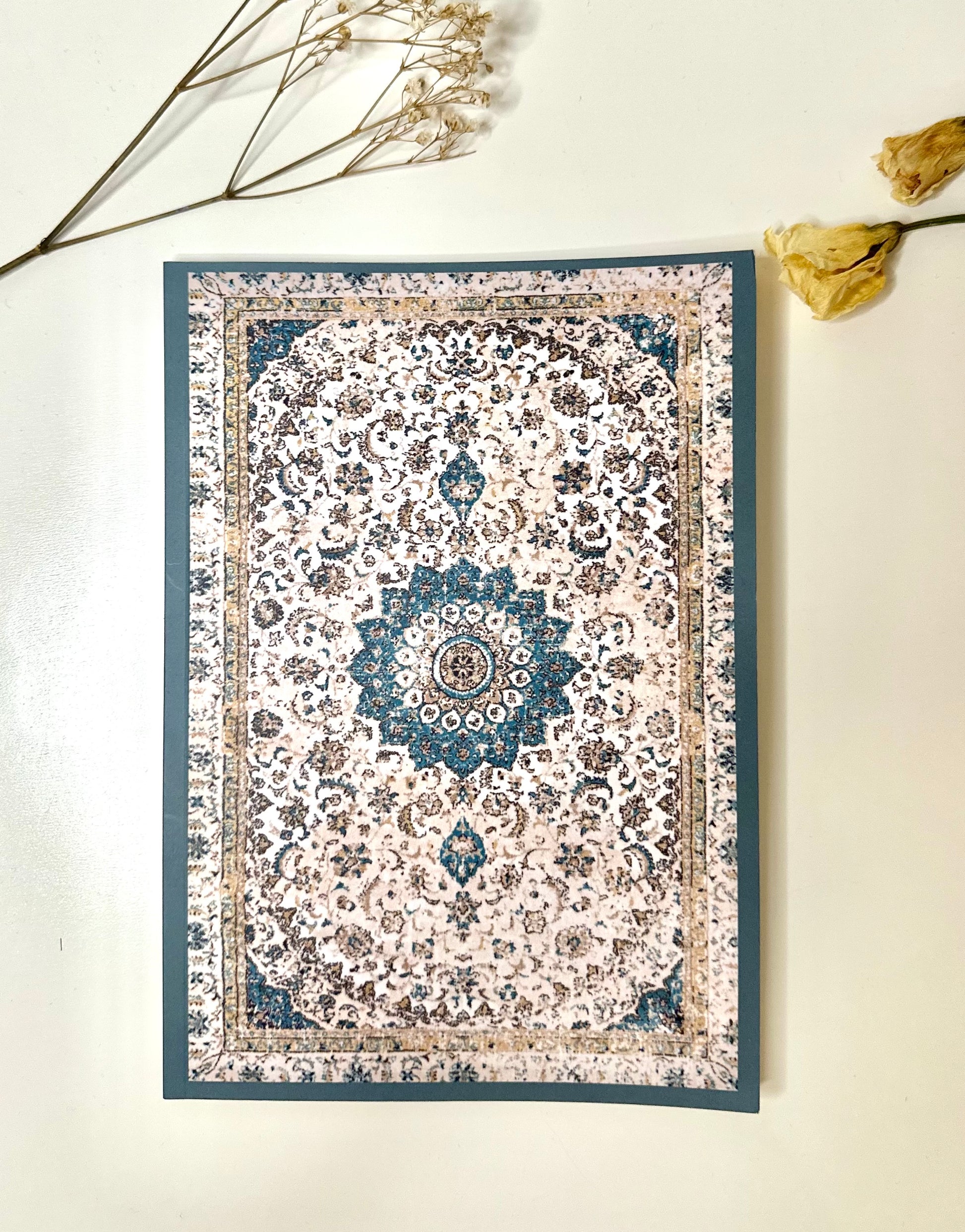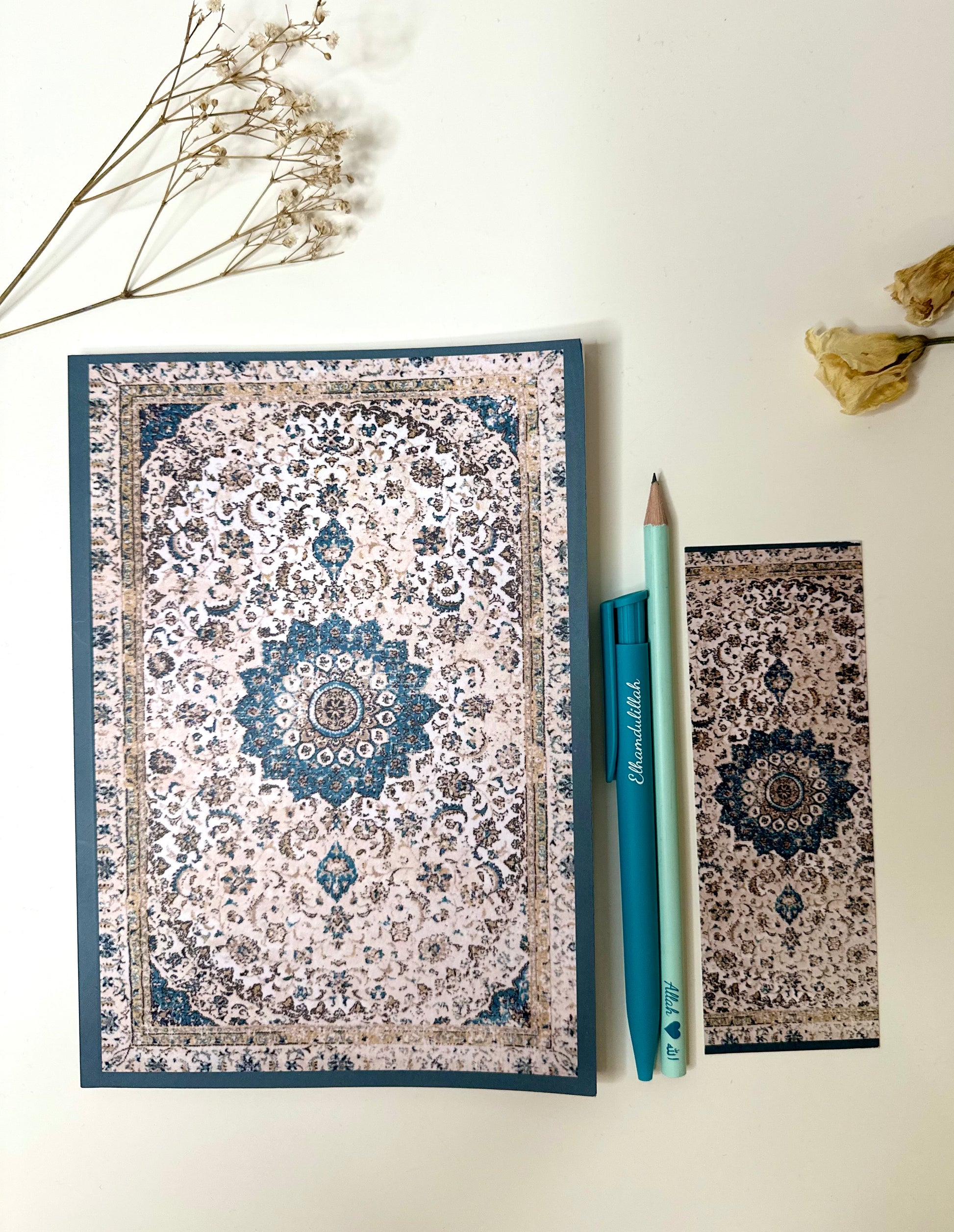 Das Türkis Rug Softcover Notizbuch vereint edles Design mit spirituellem Inhalt. Inspiriert von den feinen Mustern orientalischer Teppiche erinnert es an Ruhe, Struktur und Beständigkeit – und lädt dazu ein, die Gedanken mit „Bismillah“ zu beginnen.