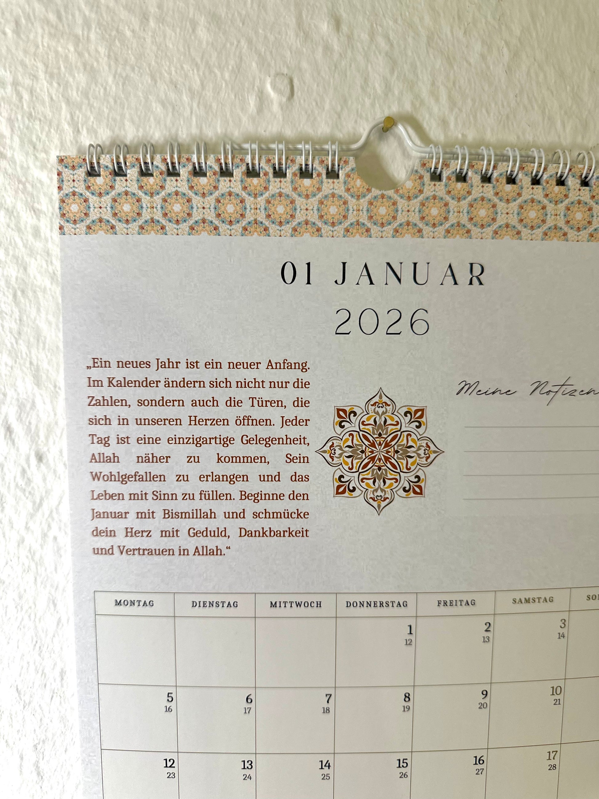 Dieser liebevoll gestaltete islamische Wandkalender begleitet dich durch das Jahr 2026 – mit inspirierenden Versen aus dem Qur’an, den Namen Allahs und wunderschönen floralen Mustern, die jeden Monat zu einem besonderen Erlebnis machen. 🌿