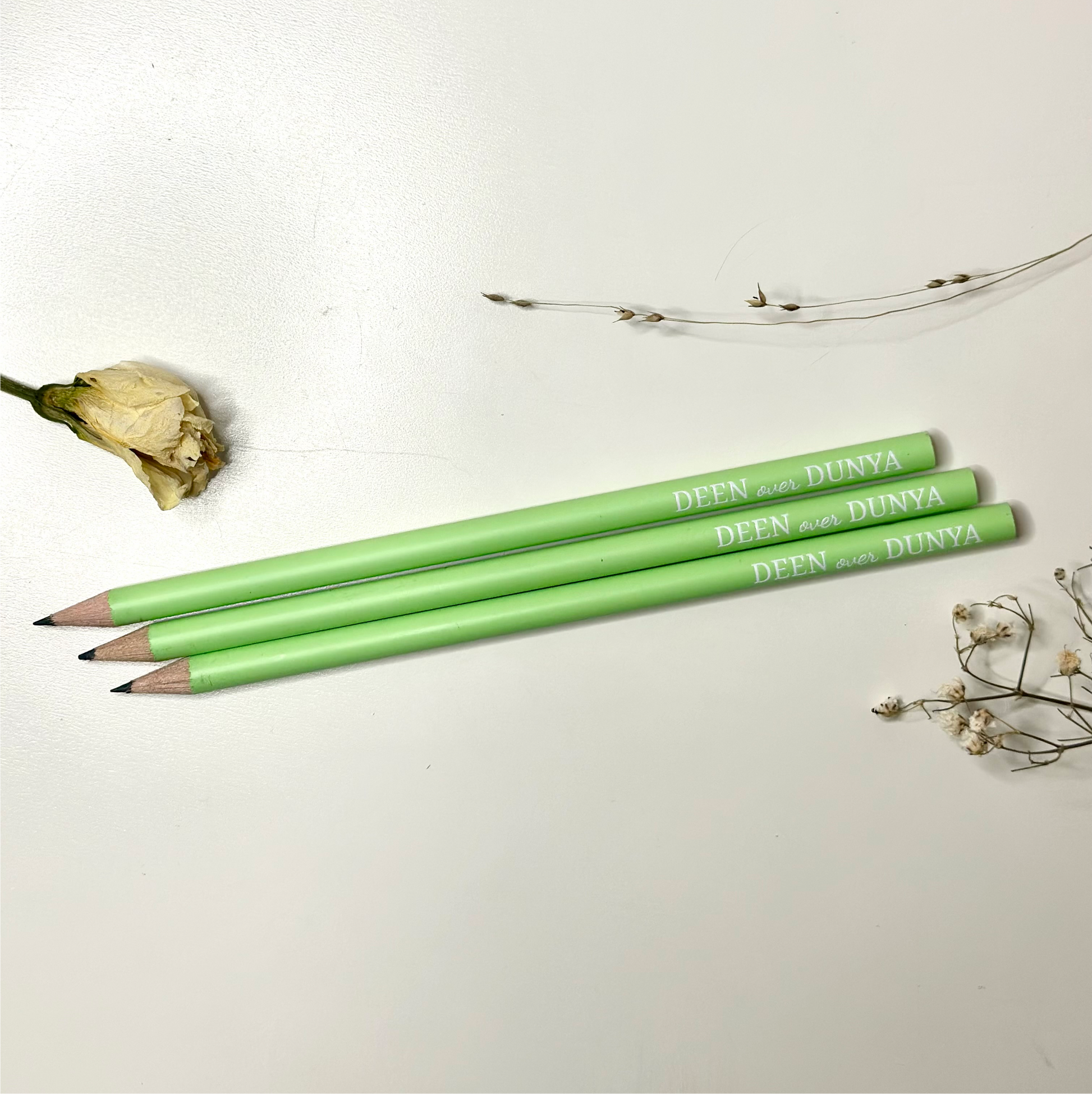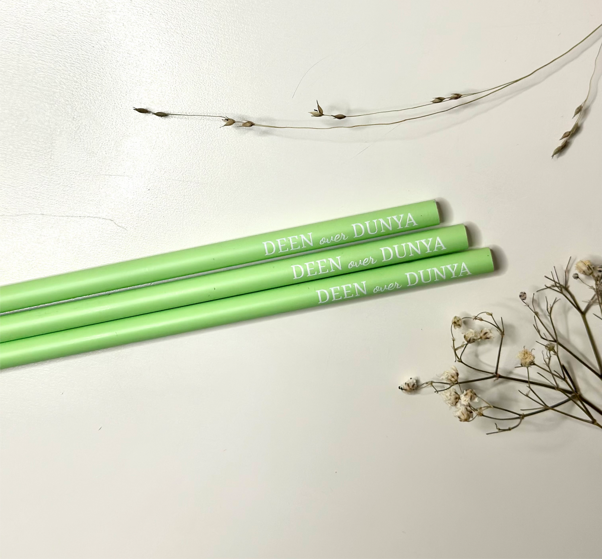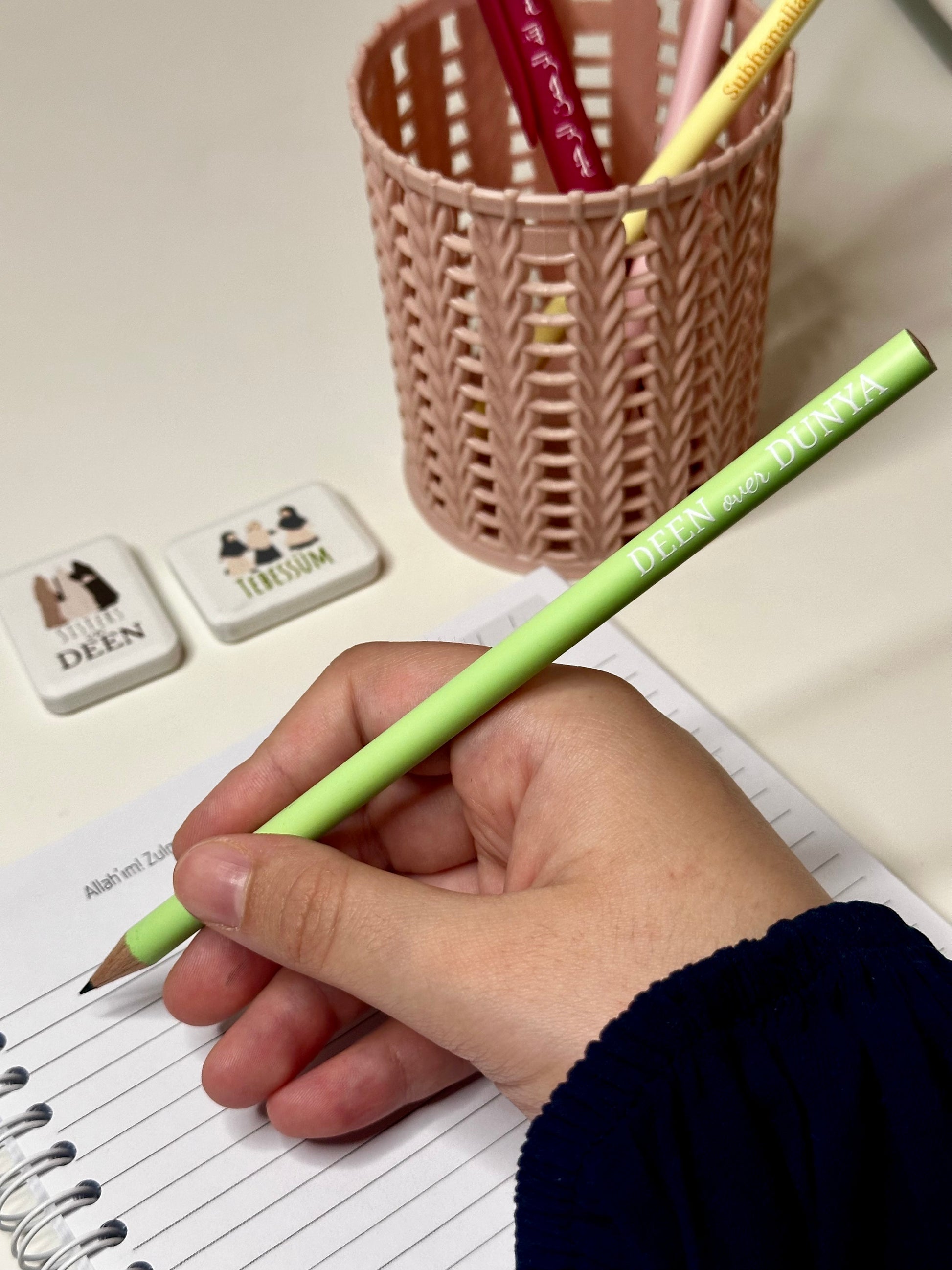 Pastellgrüner Bleistift mit der Aufschrift „DEEN over DUNYA“. Dieser stilvolle Bleistift in sanftem Grün trägt eine kraftvolle Botschaft, die daran erinnert, den Glauben über die Weltliche Dinge zu stellen. Mit seiner dezenten, aber inspirierenden Botschaft ist dieser Bleistift ein idealer Begleiter für Schule, Büro oder als tägliche Motivation, sich auf das Wesentliche zu konzentrieren.