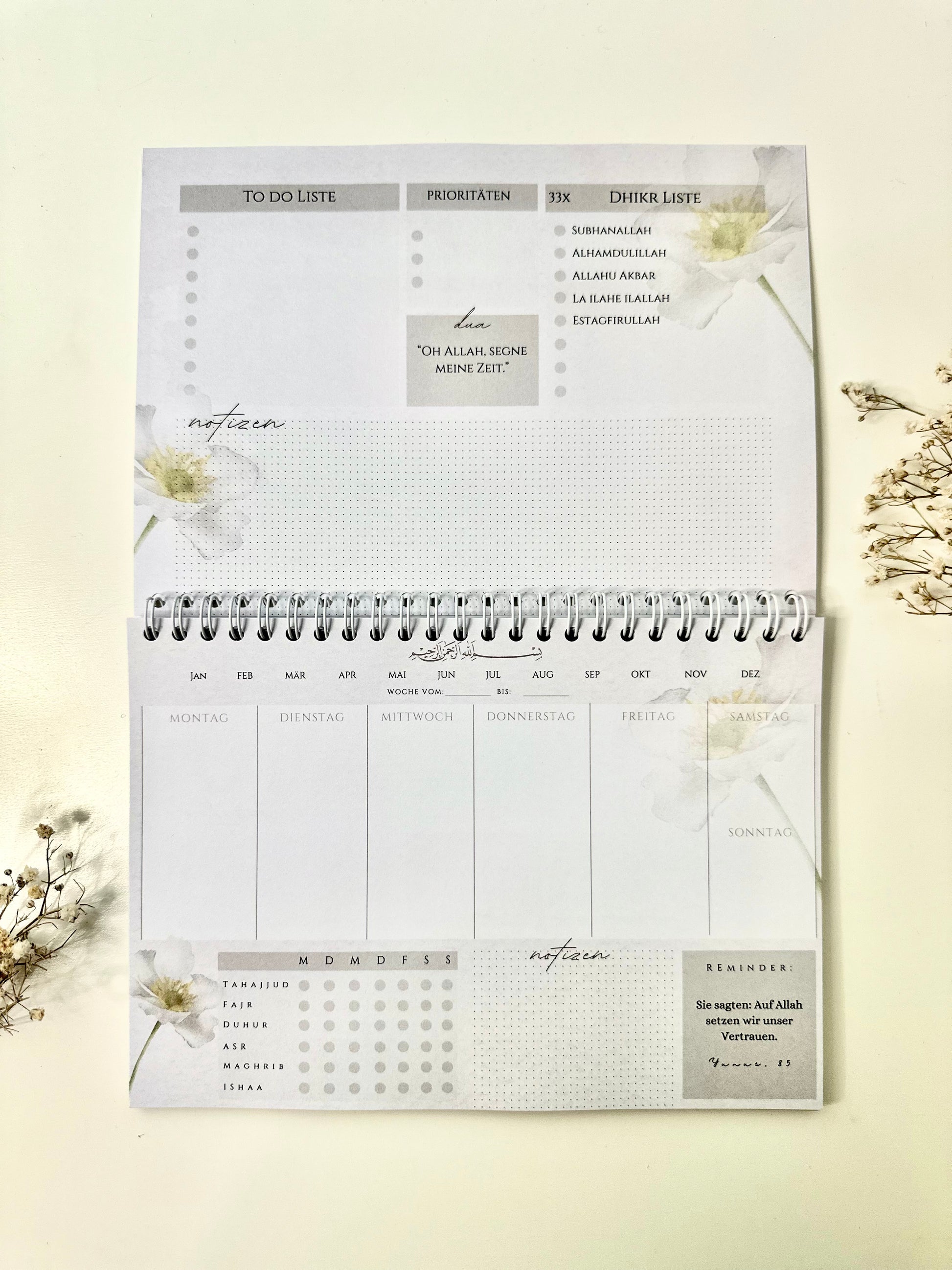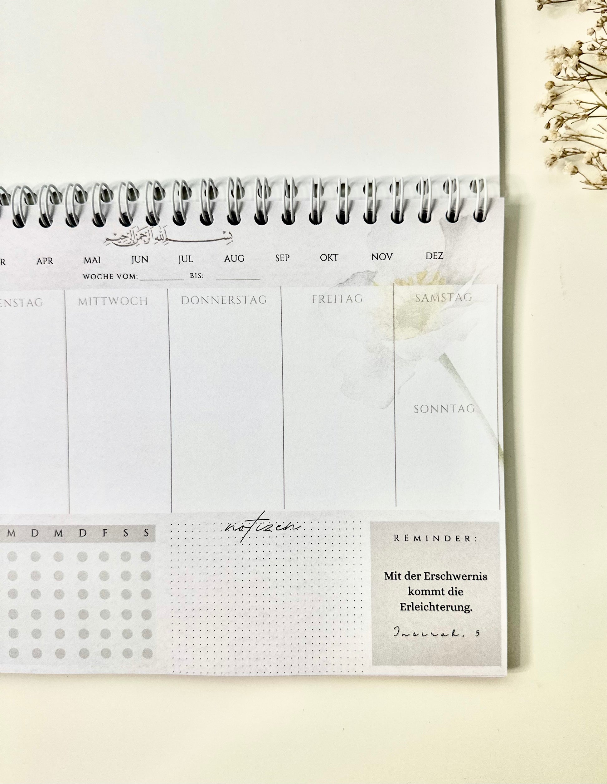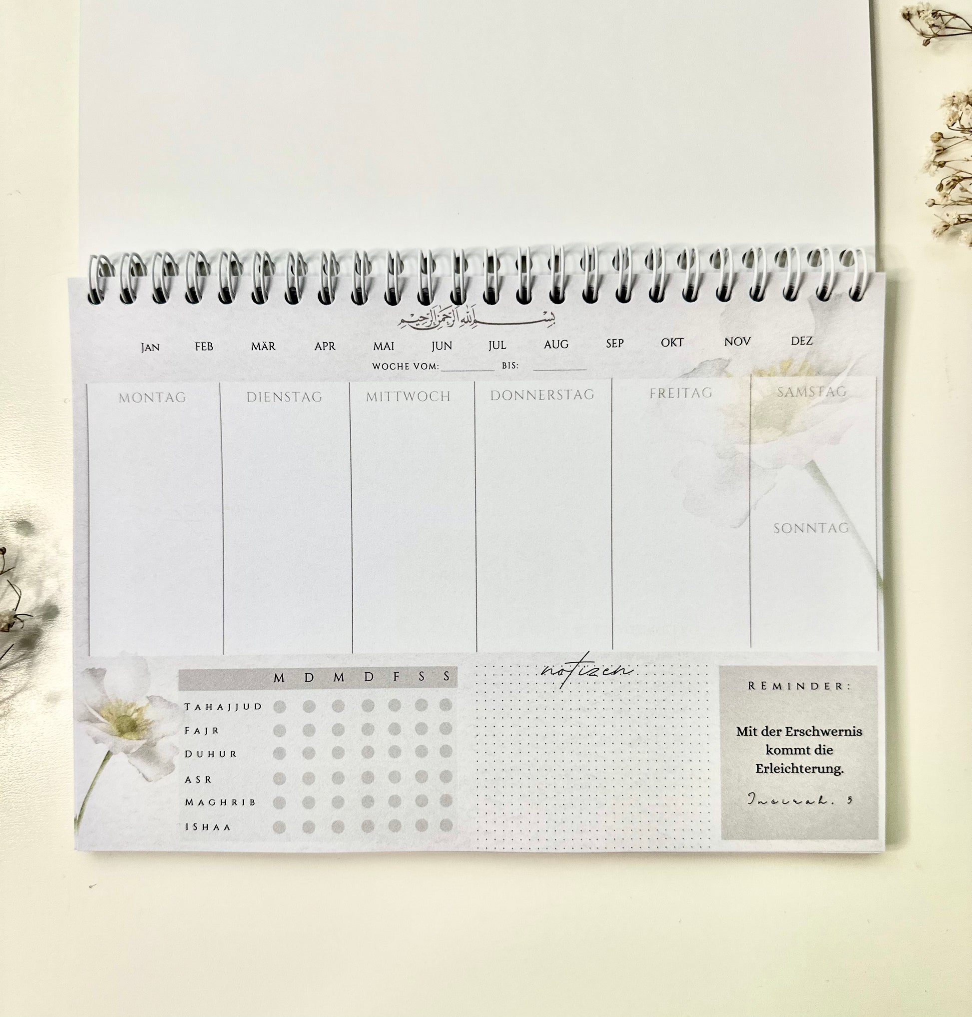 Her ay, oryantal tasarımlarla birleştirilmiş bir Kuran ayeti içeriyor. Hicri ve Miladi tarihlerin yanı sıra randevularınız için alan da mevcut. - Haftalık planlayıcı (A5):
