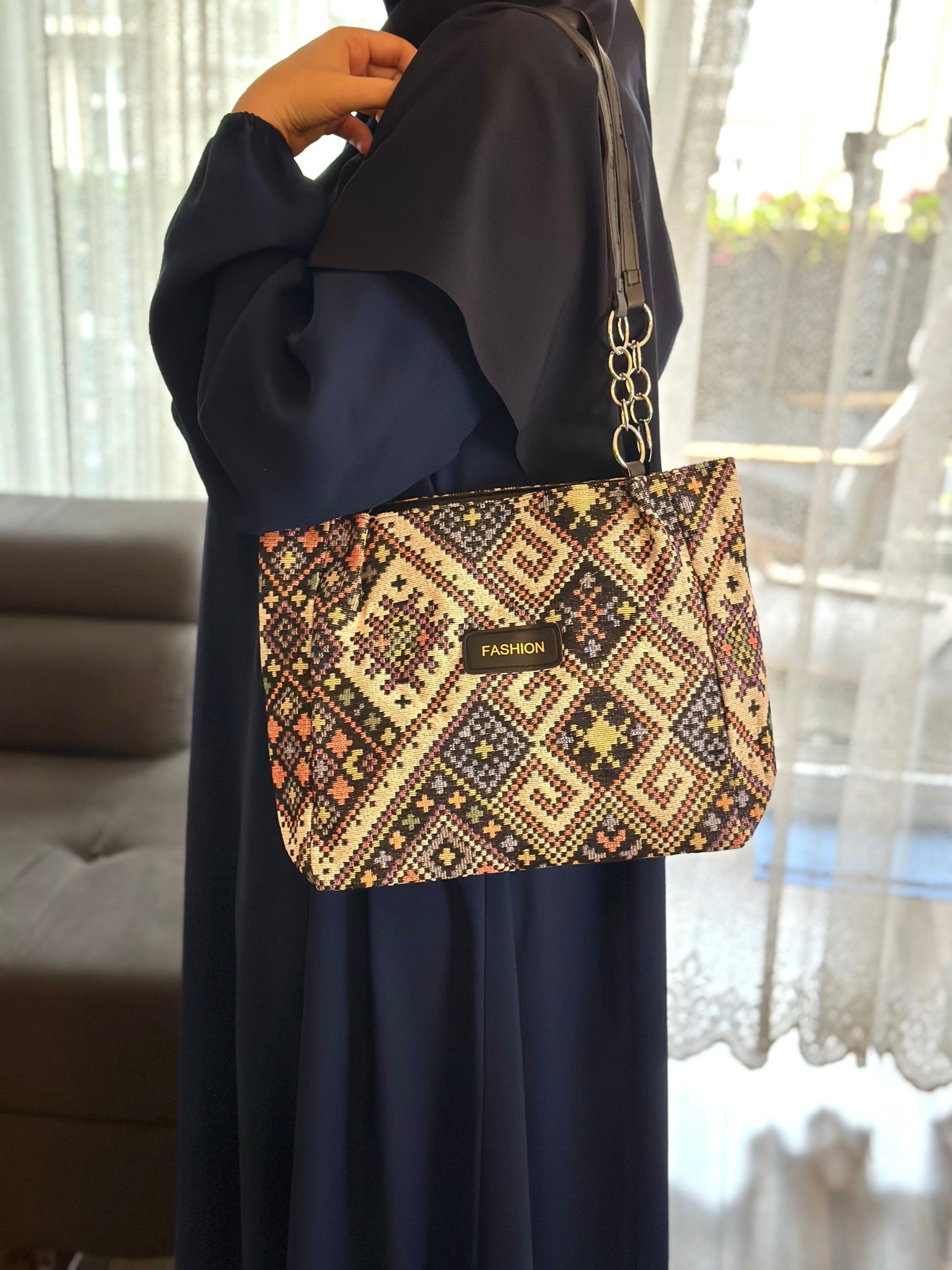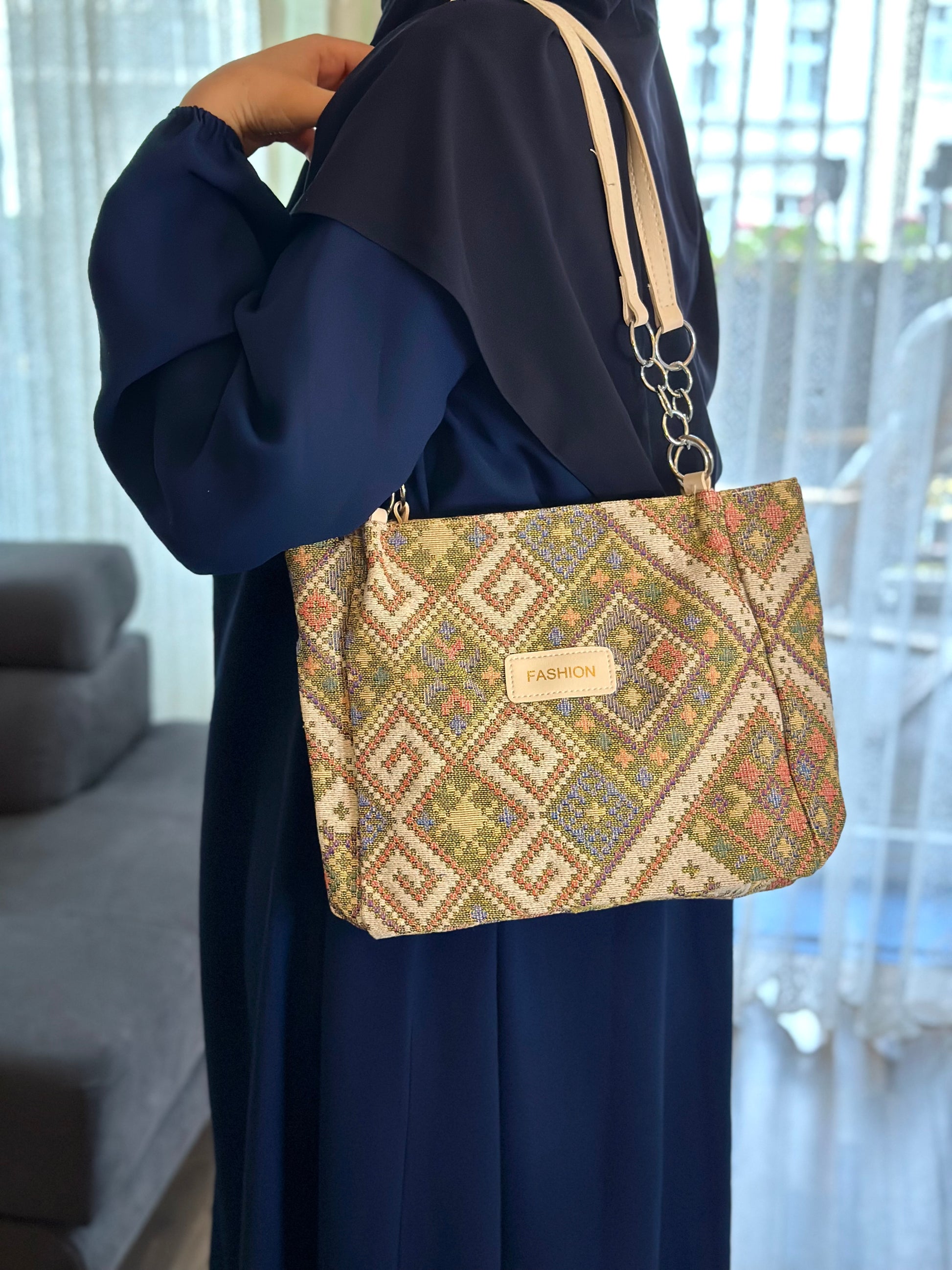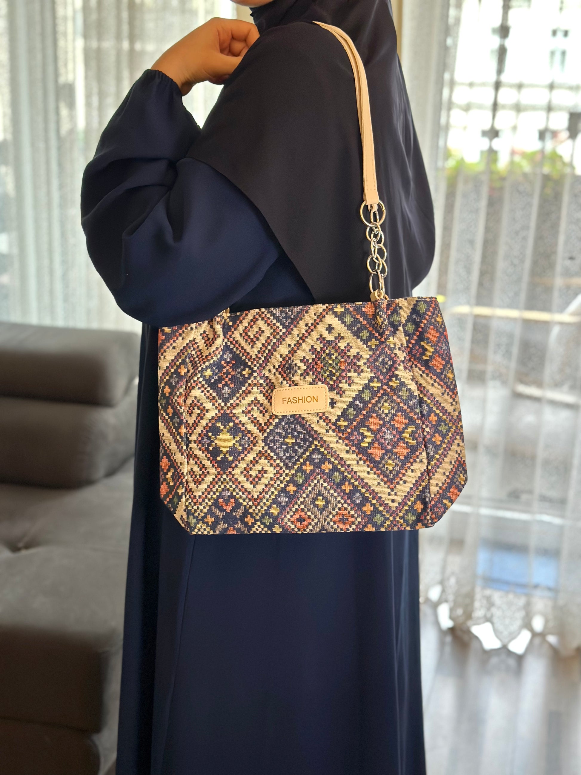 Oryantal tasarıma sahip bu zarif omuz çantasıyla Doğu'nun büyüsünü keşfedin. Geleneksel Orta Doğu halılarından ve işlemelerinden ilham alan detaylı desenler, kıyafetinize egzotizm ve kültür dokunuşu katıyor.